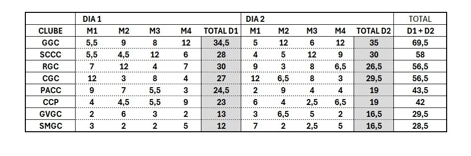 Após disputas emocionantes, o Gramado Golf Club conquistou o título de campeão com 69,5 pontos, enquanto o Santa Cruz Country Club garantiu o vice-campeonato somando 58 pontos.